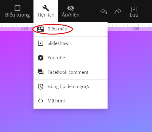 Để tạo biểu mẫu, bạn vào phần Tiện ích ở thanh công cụ bên trên và chọn biểu mẫu: