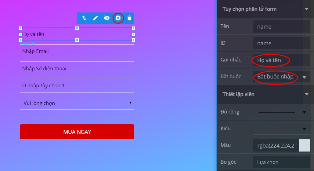 Đối với mỗi một mục thông tin, bạn có thể tuỳ chỉnh Xoá, Sửa chữ, hoặc cài đặt để người truy cập Bắt buộc nhập hay không . Nhấp chuột vào từng mục thông tin muốn chỉnh sửa, chọn biểu tượng thiết lập: