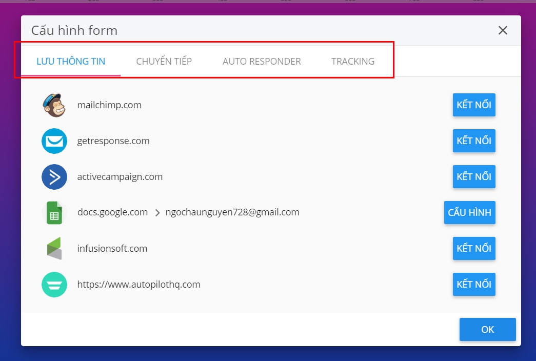 Tùy chọn cấu hình tích hợp các ứng dụng hoặc thêm tracking