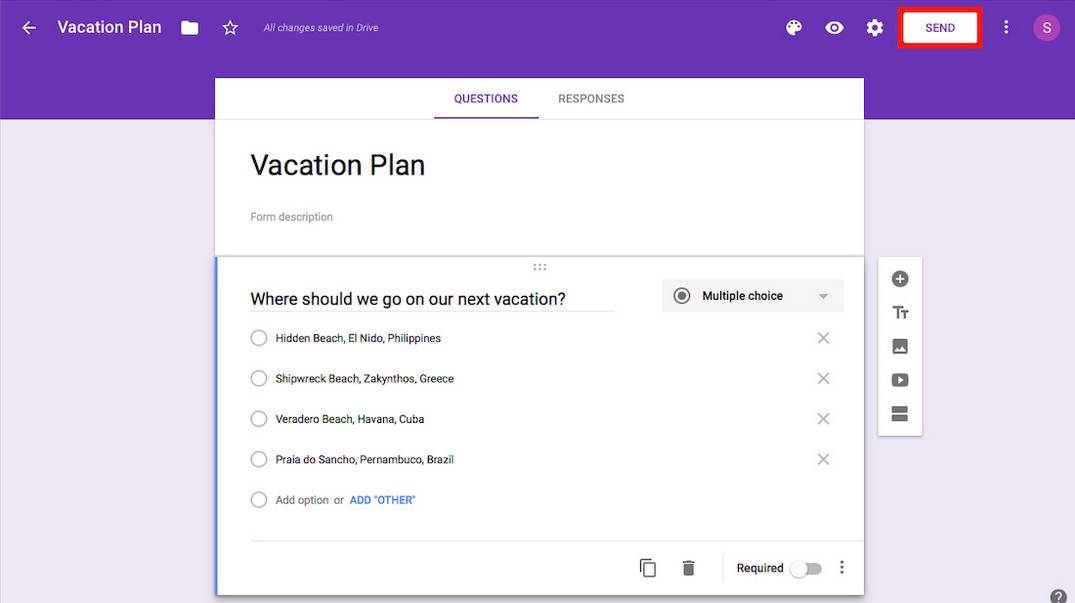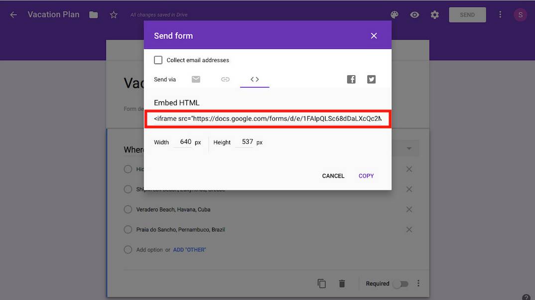 3. Lấy link nhúng sau khi bạn điền xong Google form bằng cách nhấn nút Send, nó nằm ngay góc trên bên phải trang web. Sau khi nhấn nút gửi bạn sẽ thấy link nhúng hiện lên.