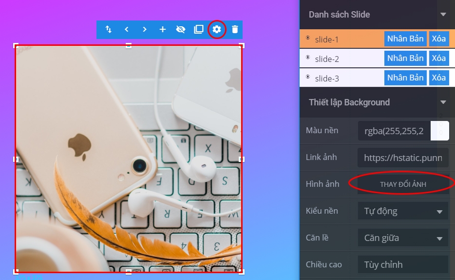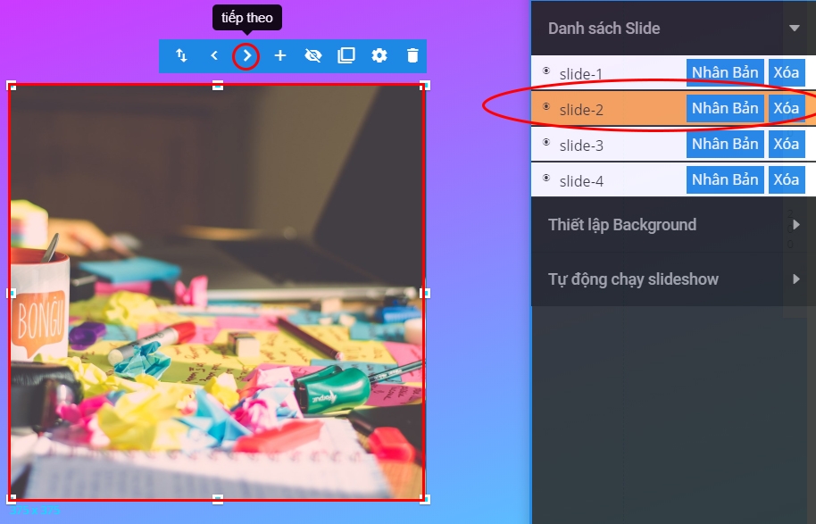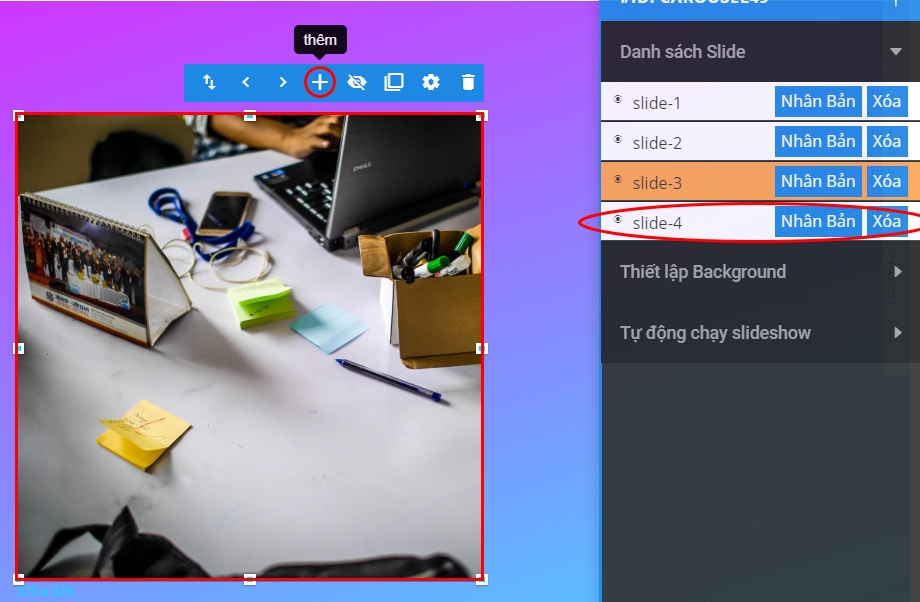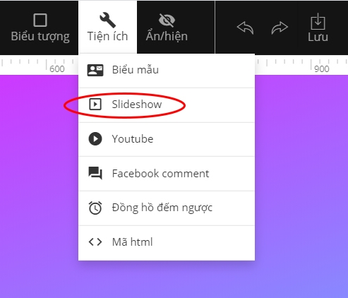 Tính năng tạo slideshow cho phép bạn tạo hiệu ứng chạy xoay vòng cho các phần tử để hiển thị dưới dạng slide sản phẩm. Để tạo slide, bạn vào phần Thêm mới ở thanh công cụ bên trên và chọn Slideshow: