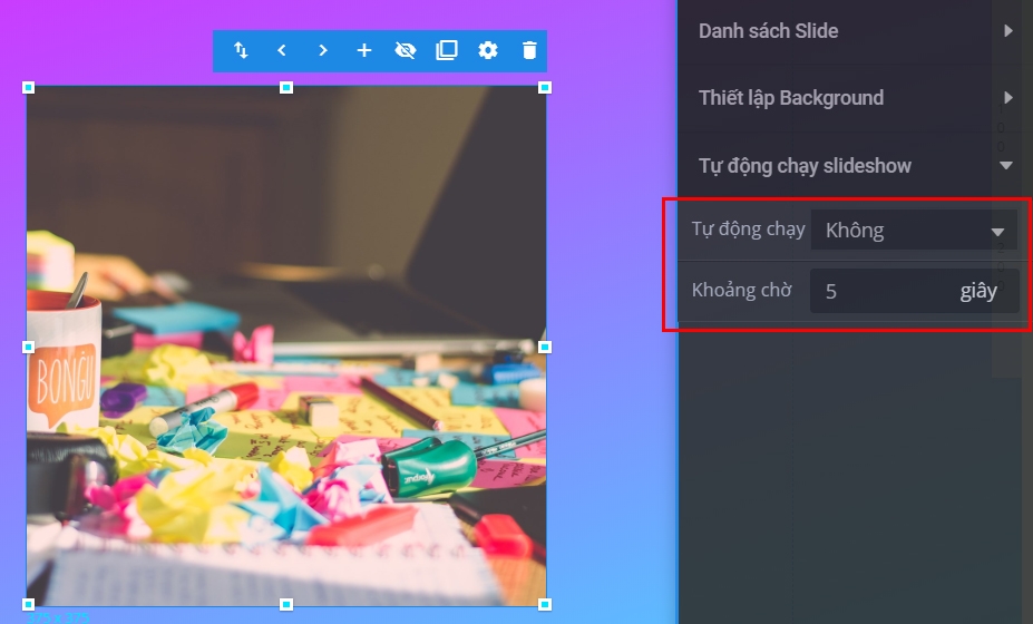 Thiết lập thay đổi thêm các tùy chọn khác như chế độ tự động chạy và thời gian chờ giữa các slide.