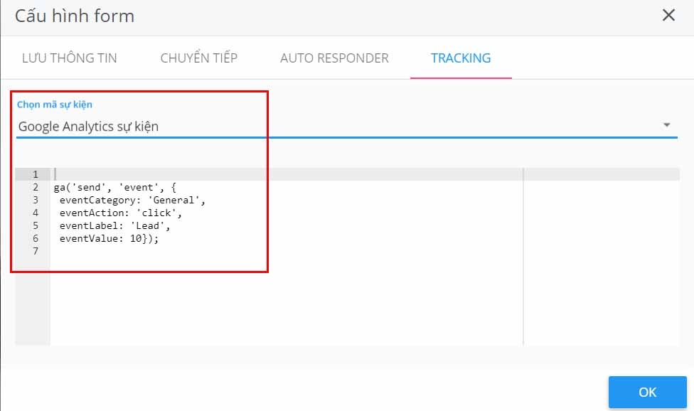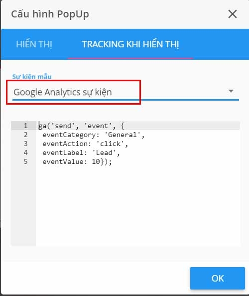 Bạn vào phần cài đặt của popup và chọn tracking hiển thị