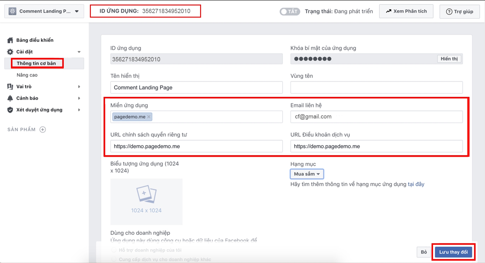 Chọn mục Thông tin cơ bản và lấy mã ID ứng dụng, sau đó nhập các thông tin sau